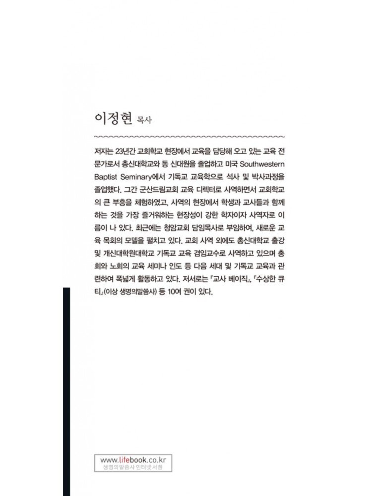 저자는 23년간 교회학교 현장에서 교육을 담당해 오고 있는 교육 전문가로서 총신대학교와 동 신학대학원을 졸업하고 미국 Southwestern Baptist Seminary에서 기독교교육학으로 석사 및 박사과정을 졸업했다. 그간 군산드림교회 교육 디렉터로 사역하면서 교회학교의 큰 부흥을 체험하였고,사역의 현장에서 학생과 교사들과 함께하는 것을 가장 즐거워하는 현장성이 강한 사역자다.최근에는 청암교회 담임목사로 부임하여,새로운 교회 목회의 모델을 펼치고 있다.교회 사역 외에도 총신대학교 출강 및 개신대학원대학교 기독교교육 겸임교수로 사역하고 있으며,총회와 노회의 교육 세미나 인도 등 다음 세대 및 기독교교육과 관련하여 폭넓게 활동하고 있다. 저서로는 『교사 베이직』,『수상한 큐티』,『얘들아 학교를 부탁해』(이상 생명의말씀사)등 10여 권이 있다.